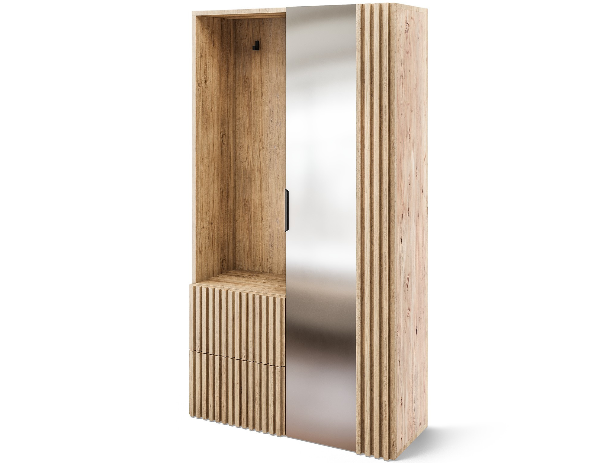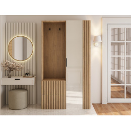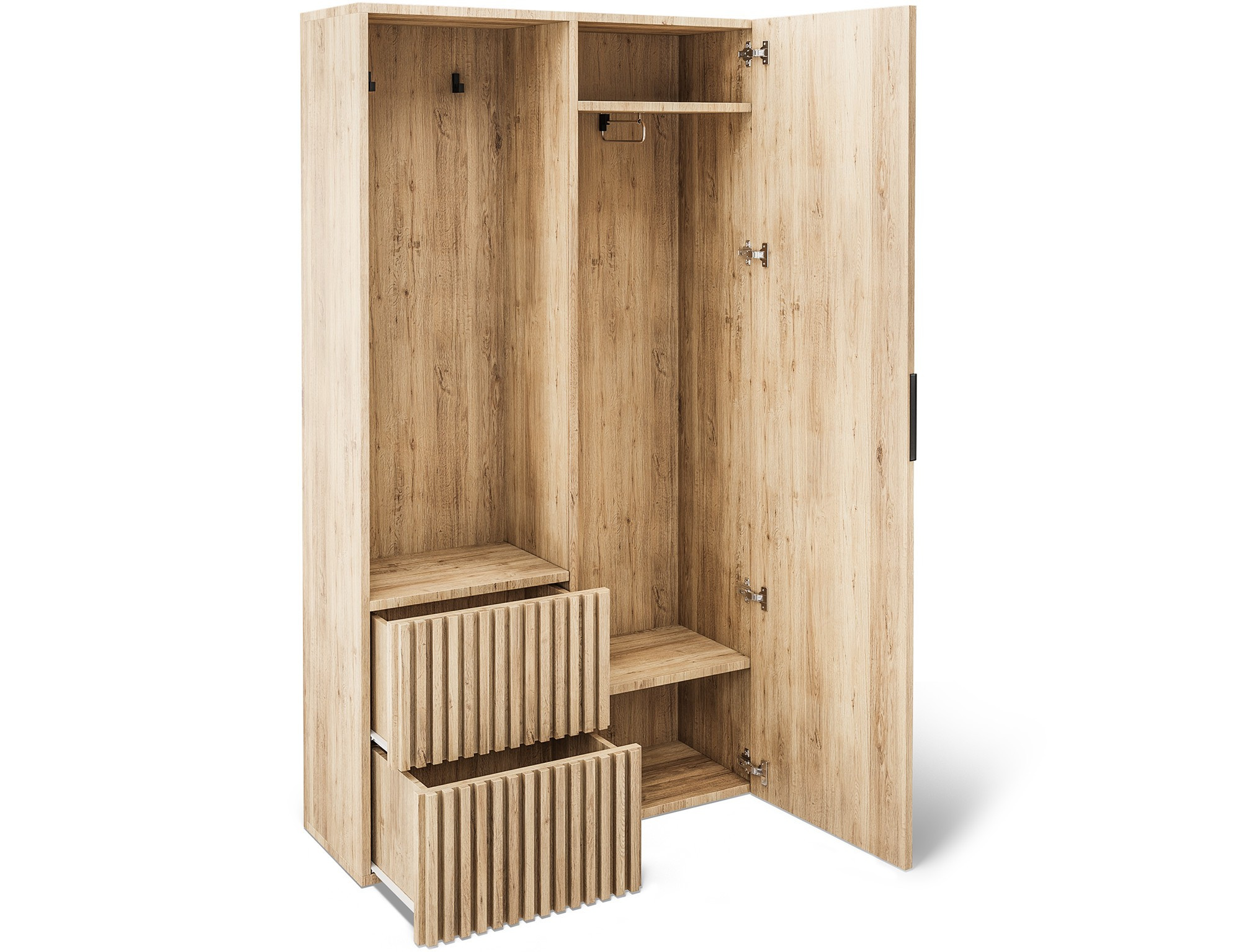 Šatní skříň Vimeiro je funkční, kompaktní kus nábytku pro chodbu, ložnici nebo šatnu, který usnadňuje každodenní organizaci; s rozměry 180 × 100 × 35 cm nabízí praktickou závěsnou tyč, 2 police s nosností až 20 kg každá a 2 prostorné zásuvky (až 10 kg každá), takže můžete úhledně uložit kabáty, bundy, boty a doplňky. Jeho stabilní konstrukce využívá 16 mm dřevotřísku pro korpus, čela a police, zatímco odolné ABS hrany chrání okraje proti každodennímu opotřebení; kovové úchyty přidávají na pevnosti a pohodlném používání a hmotnost 69 kg zdůrazňuje pevnou stavbu—díky čemuž je Vimeiro praktickou šatní skříní pro moderní domovy a byty.