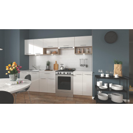délka sestavy: 260 cm, plynové výtahy, nastavení horních skříněk a nožiček spodních skříněk, tloušťka horní desky: 28 mm, barvy: čelo - bílý lesk, korpus - dub sonoma, horní deska - bílá
