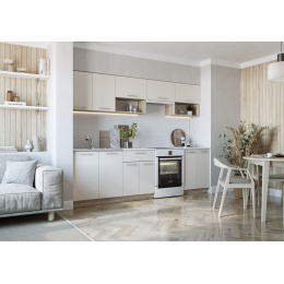 délka sestavy: 260 cm, plynové výtahy, nastavení horních skříněk a nožiček spodních skříněk, tloušťka horní desky: 28 mm, součástí k. setu jsou 2 x 60cm prac. desky na spodní 60 skříňky.