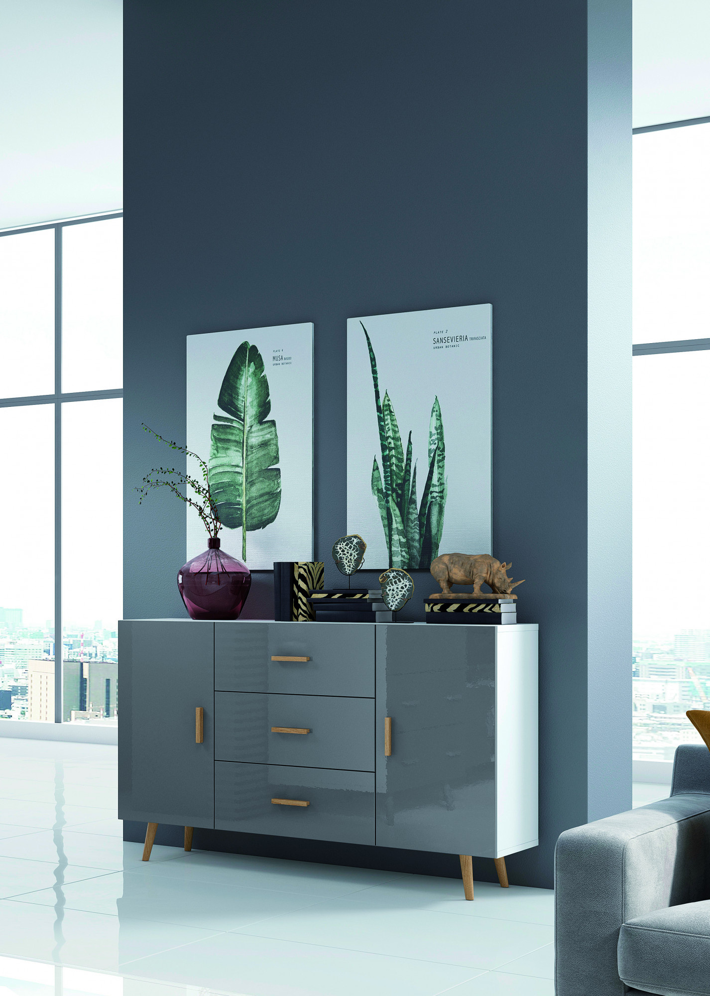 Vitrina BRILLO W2S, Bílý mat + Šedý lak