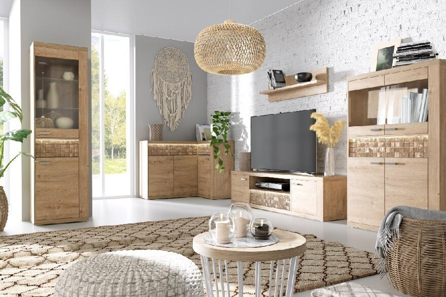 Vitrína z kolekce Natural. Horní skříňky mají prosklenou přední část a za nimi skleněnou polici. Spodní dvířka jsou celá prosklená a uprostřed mají poloprostorovou dělící polici. Mezi skříňkami je jedna velká zásuvka se systémem Push To Open, který podtrhuje měkkost nábytku. Kovové úchytky a tiché zavírání zdůrazňují smysl pro detail. Ideální do obývacího pokoje, jídelny nebo předsíně. Mnohé překvapí svým vzhledem. K dispozici v jedné barvě.