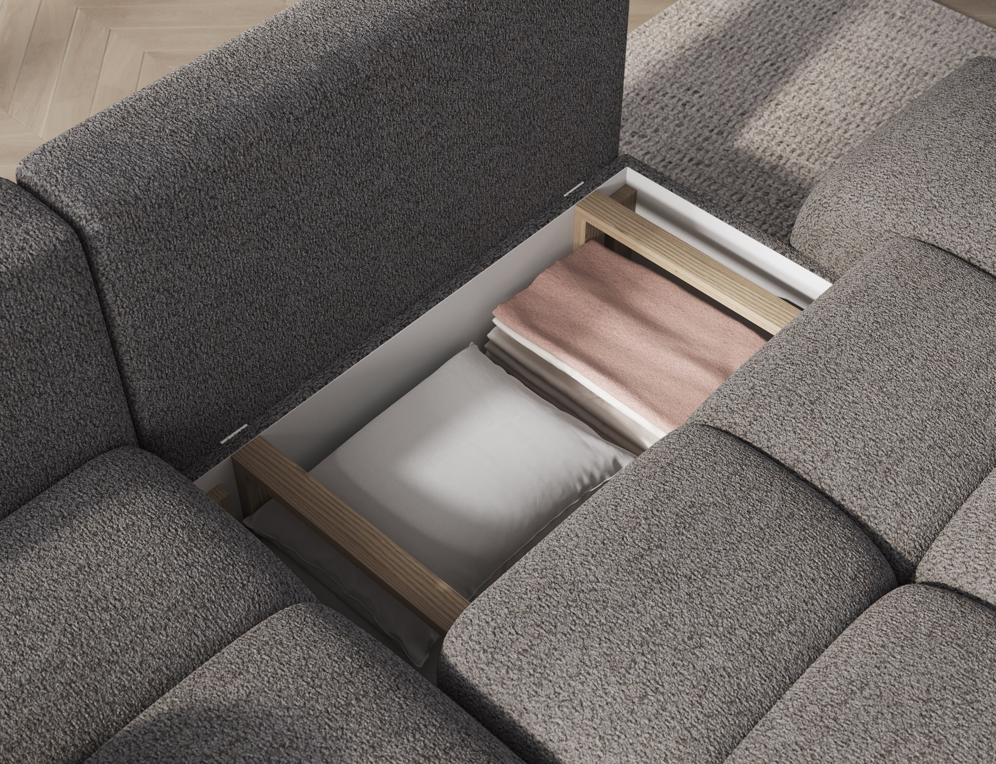 Rohová pohovka Vittario je moderní a funkční kus nábytku navržený pro maximální pohodlí. Jeho kubický tvar a jemné linie se dokonale snoubí s moderními interiérovými designy. Tento kus měří 227 × 170 × 95 cm a váží 115.4 kg, zajišťující stabilitu a dlouhotrvající odolnost. Sedák je vyplněn vlnovou pružinou typu B, pěnou HR3030 a pěnou T2315. Opěradlo se skládá z polštářů naplněných pěnovými granulemi, které se přizpůsobují tělu a poskytují měkké, relaxační pohodlí. Pohovka je vybavena funkcí spaní, která nabízí plochu 95 × 205 cm, a také DL mechanismem s pružinou, který podporuje snadné a rychlé rozložení. Další výhodou je úložný prostor na ložní prádlo, který pomáhá udržovat obývací pokoj uklizený. Vittario je kombinací praktičnosti, estetiky a pohodlí, ideální pro moderní prostory.