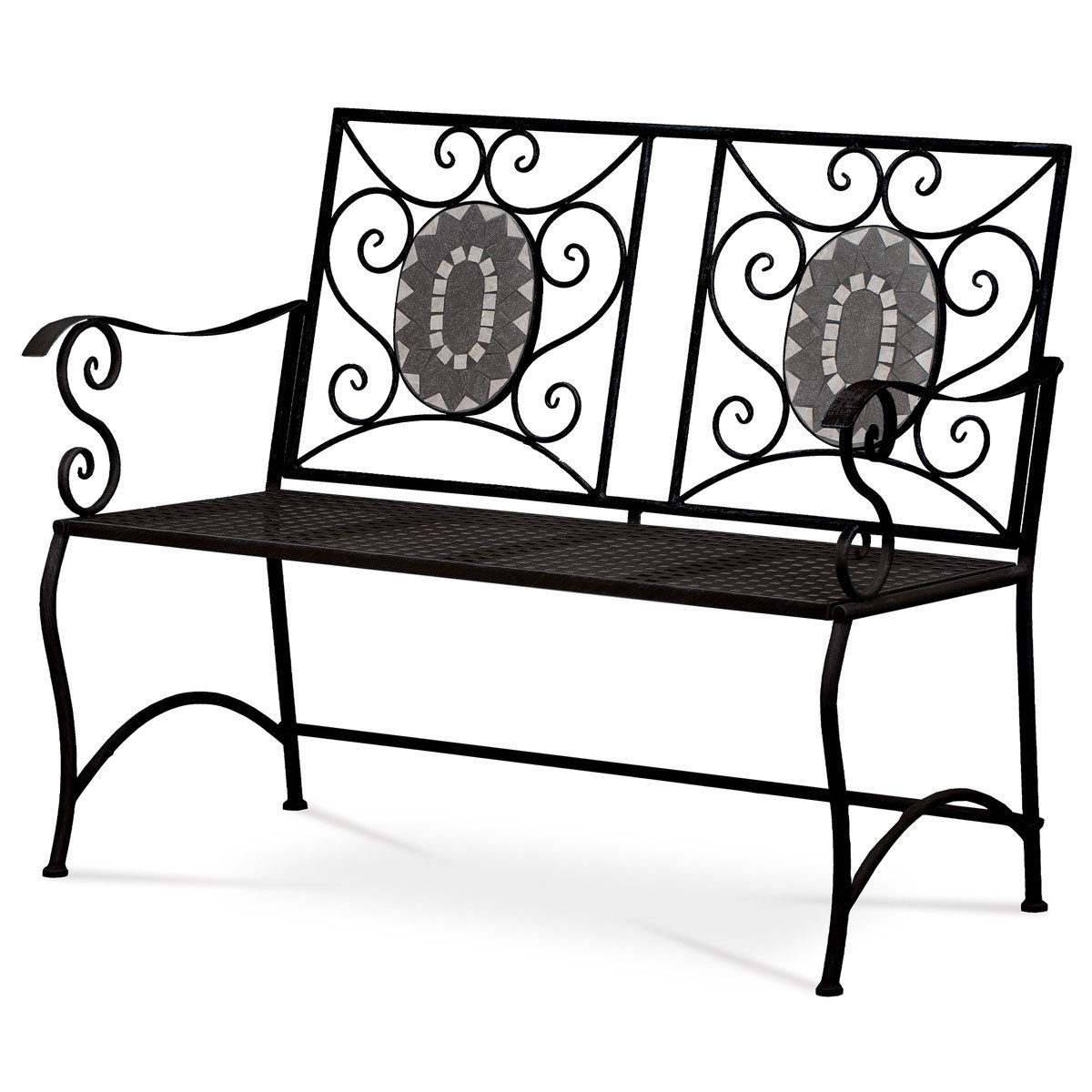 Zahradní lavice, keramická mozaika, kov, černý lak
