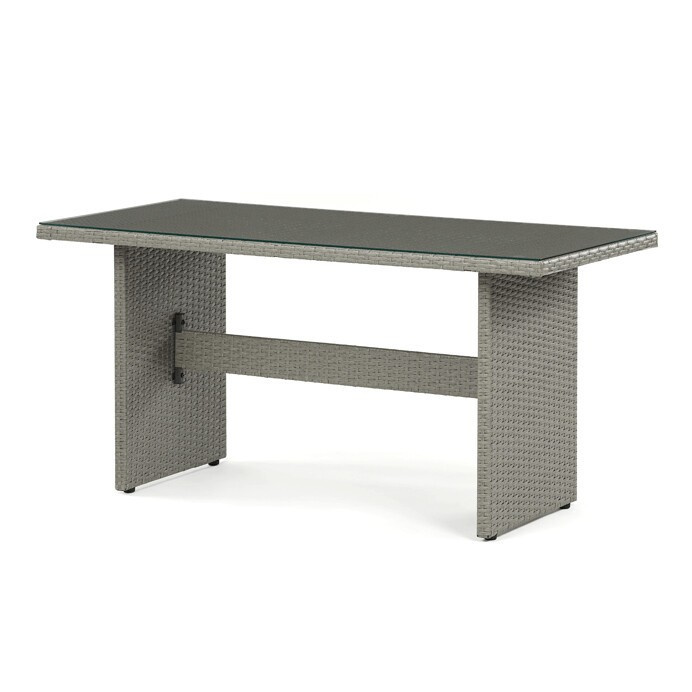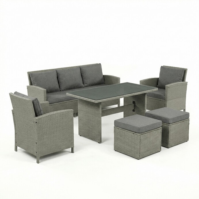 Zahradní sestava s jídelním stolem v šedém provedení kombinuje pevnou kovovou konstrukci s elegantním povrchem z umělého ratanu, který věrně imituje přírodní materiál. Deska stolu je vyrobena z tvrzeného skla, což usnadňuje údržbu a dodává sestavě moderní vzhled. Sedací část tvoří dvě křesla a dvě taburety, všechny vybavené polstrovanými sedáky a opěrkami potaženými příjemnou šedou látkou pro zvýšení komfortu. Konstrukce je navržena tak, aby zajistila stabilitu a dlouhou životnost i při venkovním použití. Celkový design sestavy je ideální pro relaxaci i stolování na zahradě či terase.