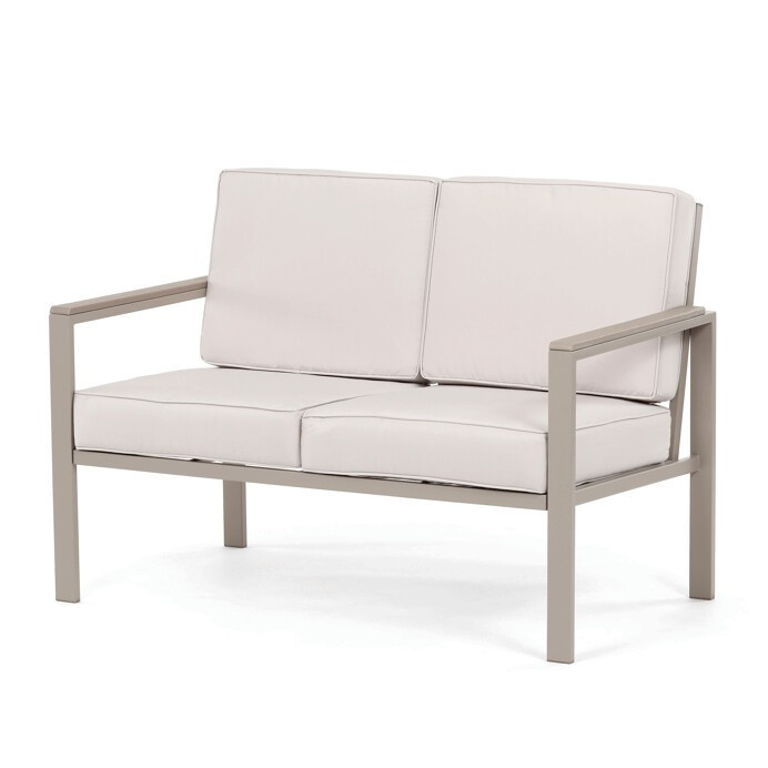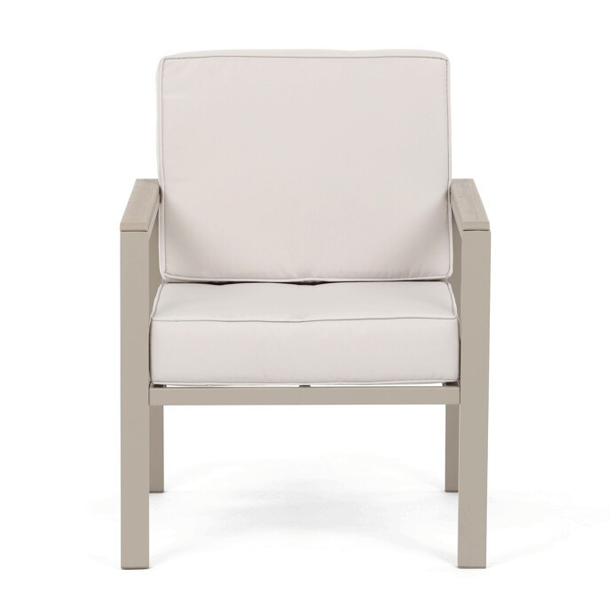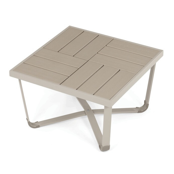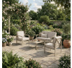 Zahradní sestava v béžovém provedení kombinuje pevný kovový rám s pohodlnými sedáky potaženými odolnou látkou v béžové barvě. Desky stolku i područky jsou vyrobeny z polywoodu, materiálu známého svou vysokou odolností vůči povětrnostním vlivům a snadnou údržbou. Konstrukce sestavy je navržena tak, aby poskytovala stabilitu a komfort při venkovním posezení, přičemž polstrování zajišťuje pohodlné sezení i během delšího užívání. Součástí jsou dvě samostatné křesla a dvoumístná pohovka, které společně s praktickým stolkem vytvářejí ideální prostor pro relaxaci na zahradě či terase. Celkový design je jednoduchý a moderní, vhodný pro různé venkovní prostory.