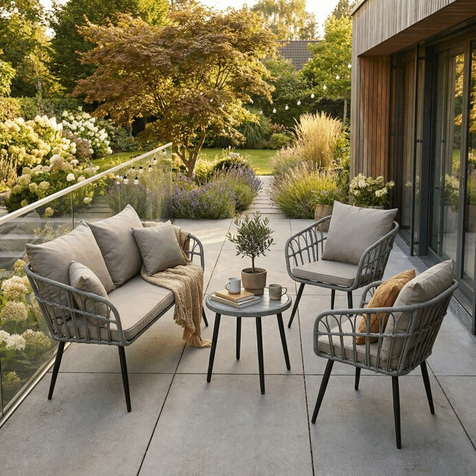 Zahradní sedací souprava 1+2+1+1 kombinuje moderní design s praktickými materiály vhodnými pro venkovní použití. Pevná kovová konstrukce v černé barvě zajišťuje stabilitu a dlouhou životnost, zatímco výplet z umělého ratanu dodává lehkost a přírodní vzhled. Sedáky a opěradla jsou potaženy šedou voděodolnou látkou, která se snadno udržuje a odolává vlivům počasí. Stolová deska z polywoodu je odolná vůči vlhkosti a mechanickému poškození, což ji předurčuje pro venkovní prostředí. Souprava je vybavena pohodlnými područky a ergonomicky tvarovanými sedáky, které podporují komfort při relaxaci na zahradě či terase.