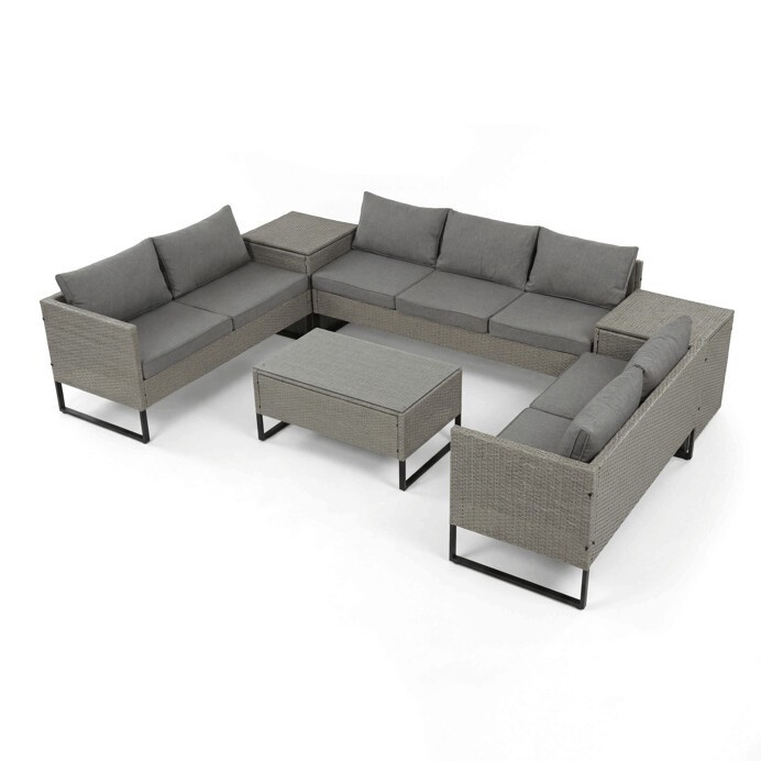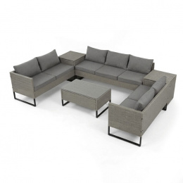Zahradní sestava s úložným prostorem kombinuje pevnou kovovou konstrukci s kvalitním umělým ratanem v šedém odstínu, který je odolný vůči povětrnostním vlivům. Sedací části jsou čalouněné šedou voděodolnou látkou, která zajišťuje pohodlí i snadnou údržbu. Součástí sestavy je praktický konferenční stolek s deskou z tvrzeného skla, která je pevná a snadno omyvatelná. Úložný prostor integrovaný do sestavy umožňuje ukládání drobných předmětů a pomáhá udržet pořádek. Rozměry jednotlivých částí jsou navrženy pro komfortní posezení a sestava je vhodná pro relaxaci na zahradě či terase.