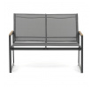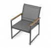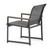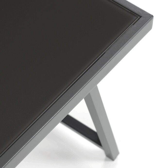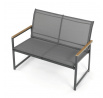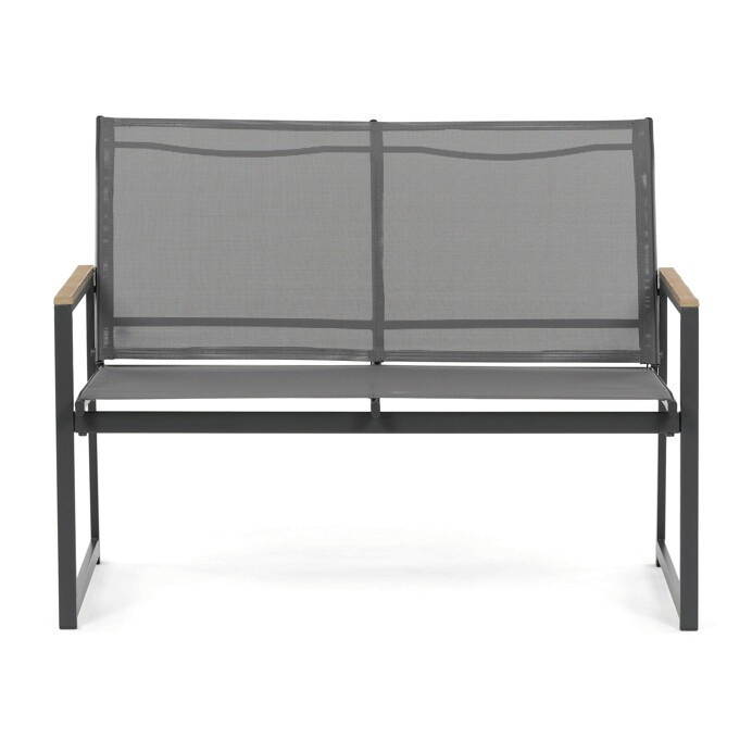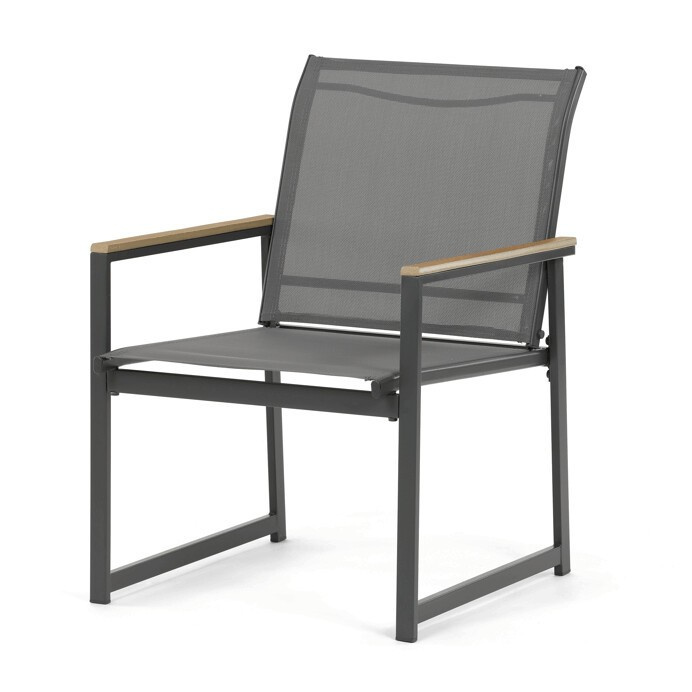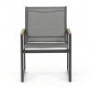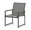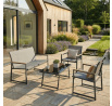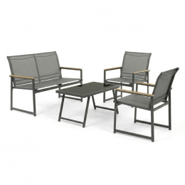 Zahradní set v šedém provedení kombinuje pevný kovový rám s komfortním textilním potahem sedáků a opěradel, které zajišťují pohodlné posezení. Stolová deska je vyrobena z černého tvrzeného skla, které je odolné vůči povětrnostním vlivům a snadno se udržuje. Dřevěné polywoodové doplňky na područkách přidávají přírodní akcent a zároveň zvyšují komfort při opření rukou. Nadčasový design s čistými liniemi se hodí do různých zahradních aranžmá a vytváří příjemné prostředí pro relaxaci i společenská setkání. Stabilní konstrukce zajišťuje bezpečnost a dlouhou životnost celé sestavy.