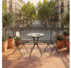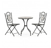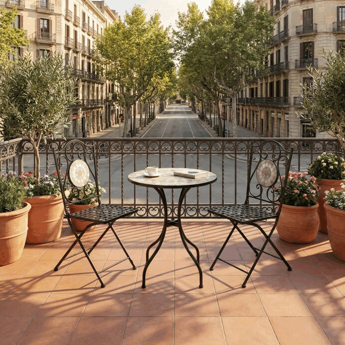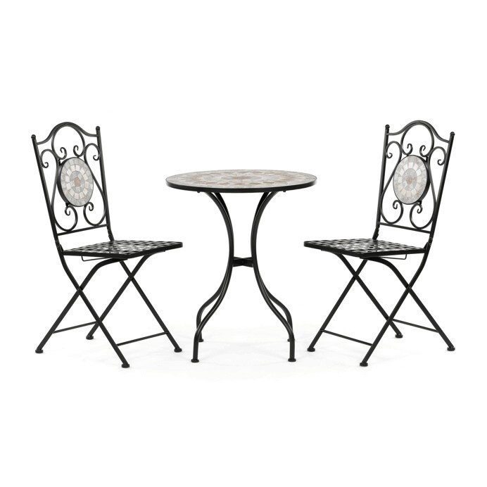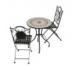 Zahradní set US1400 se skládá z kulatého stolu a dvou židlí s pevnou kovovou konstrukcí v černém provedení. Deska stolu je vyrobena z keramické mozaiky, která kombinuje přírodní odstíny a vytváří dekorativní vzor s dlouhou životností a snadnou údržbou. Židle mají sedáky s mřížkovým vzorem a opěradla zdobí keramické kruhové vložky, které ladí s designem stolu. Stabilní kovová podnož zajišťuje pevnost a odolnost setu, vhodného pro použití na balkónech i zahradách. Kompaktní rozměry umožňují pohodlné usazení dvou osob a přispívají k praktickému využití prostoru.