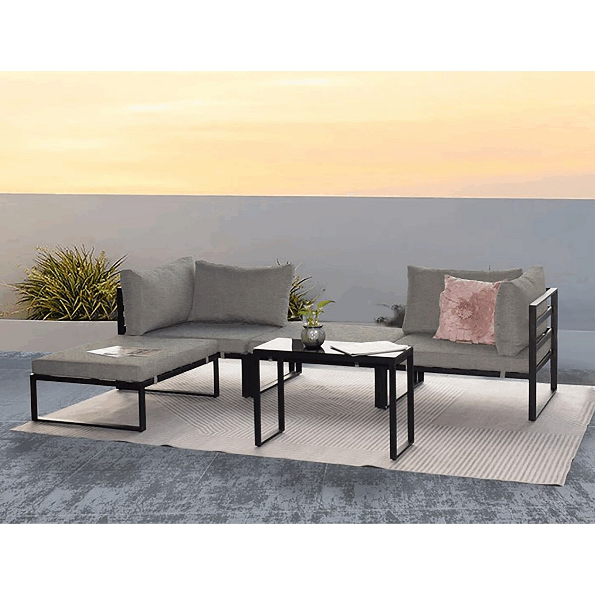 Moderní zahradní sestava značky Autronic je dokonalým řešením pro váš venkovní prostor. Sestava je multifunkční a umožňuje variabilní uspořádání podle vašich potřeb. Pevná kovová konstrukce s práškovou povrchovou úpravou v antracitových barvách je doplněna pohodlnými světle šedými látkovými sedáky, které jsou pevně připevněny ke konstrukci pro maximální stabilitu. Deska stolku z tvrzeného skla dodává sestavě elegantní vzhled, zatímco moderní design zaručuje stylový doplněk do vaší zahrady nebo na terasu.