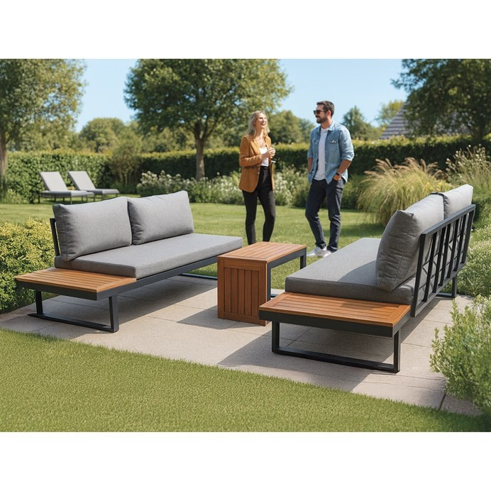 Obrovskou výhodou této zahradní sestavy je až neuvěřitelná variabilita. Sedačku tvoří dva samostatné stejné díly o rozměru 176 x 70cm.Díky tomu, že se zádové opěrky jednoduše nasadí na jejich konstrukci, bez šroubování, dokážete si sami během jedné minuty sedačku přeskládat podle aktuální potřeby. Jde tak vytvořit tři druhy rohových sedacích souprav, sestavu, která má dvě sedačky proti sobě, zahradní postel nebo dva otomany. Variabilní je též stolek, který má nožičky jak na kratší, tak delší straně, a může tak sloužit buď jako konferenční stolek, anebo jako stolek servírovací (na výšku).