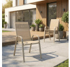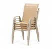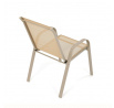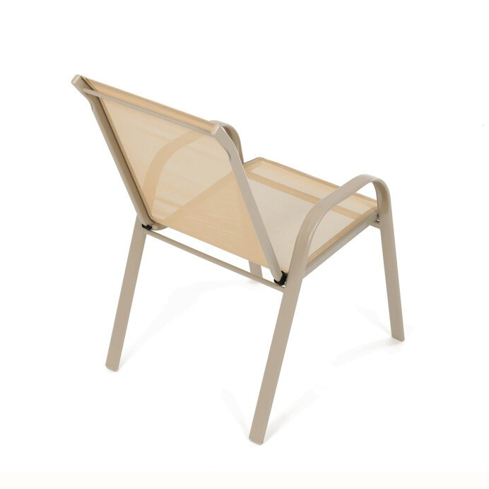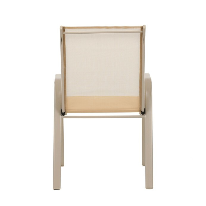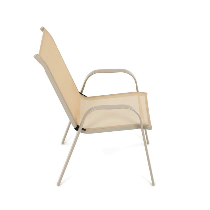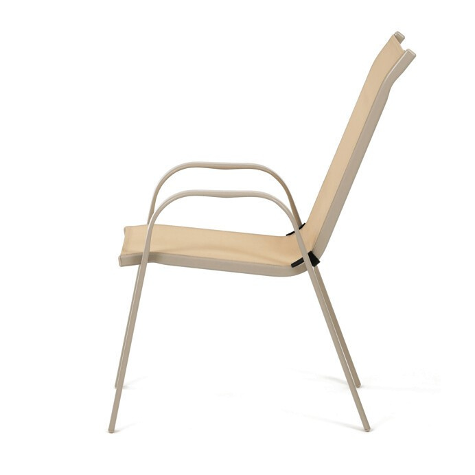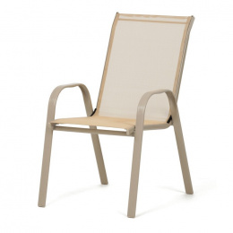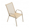 Zahradní židle v krémovém provedení kombinuje pevný kovový rám se sedákem a opěradlem z krémové síťoviny, které zajišťují pohodlné posezení venku. Konstrukce je navržena tak, aby byla stohovatelná, což usnadňuje skladování a manipulaci při sezónním ukládání. Kovová podnož je opatřena práškovým lakem, který chrání proti povětrnostním vlivům a zajišťuje dlouhou životnost. Ergonomický tvar opěradla podporuje správné držení těla během odpočinku. Rozměry a nosnost odpovídají běžným standardům zahradního nábytku, což umožňuje univerzální použití na terasách, balkonech i zahradách.
