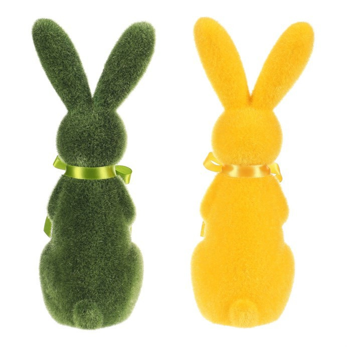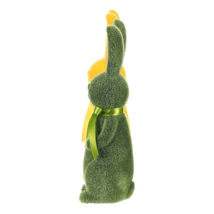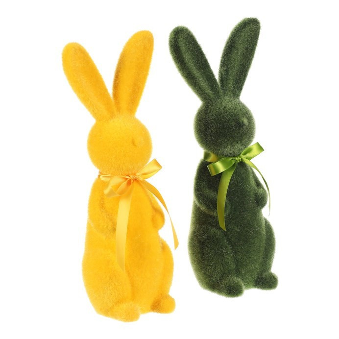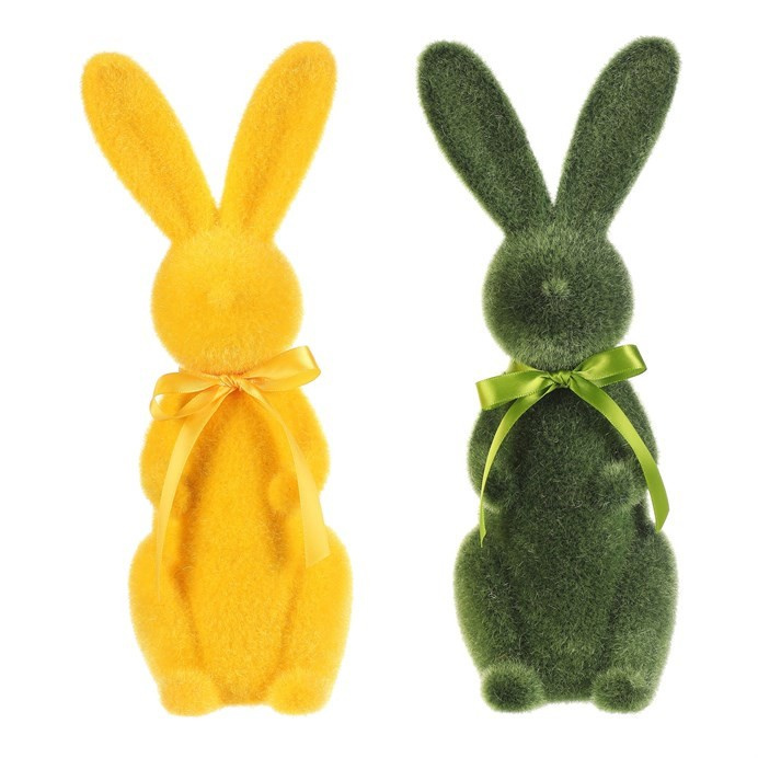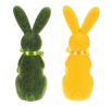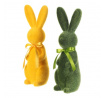 Figurka zajíce v semišovém vzhledu je vyrobena z plastu a nabízí jemnou texturu připomínající přírodní materiál. Vysoká postava s dlouhýma ušima a barevnou stuhou kolem krku vytváří dekorativní prvek vhodný pro jarní i velikonoční výzdobu. Díky provedení na postavení snadno zapadne do různých interiérů, kde přidá hravý a svěží akcent. K dispozici ve dvou barevných variantách – žluté a zelené, které lze kombinovat pro pestřejší efekt.