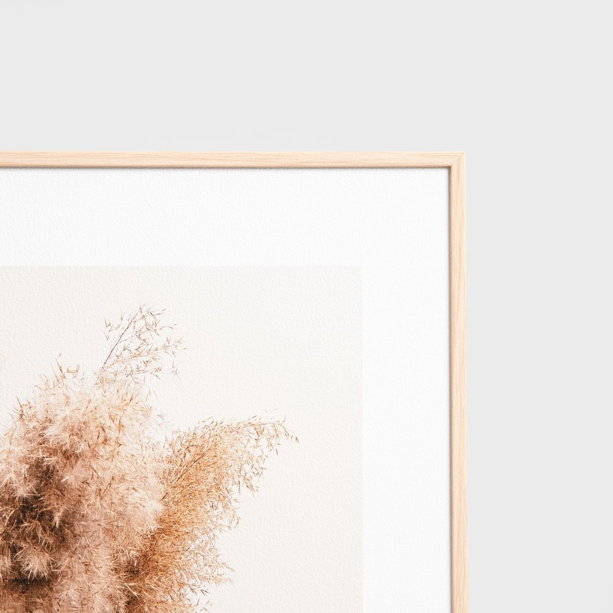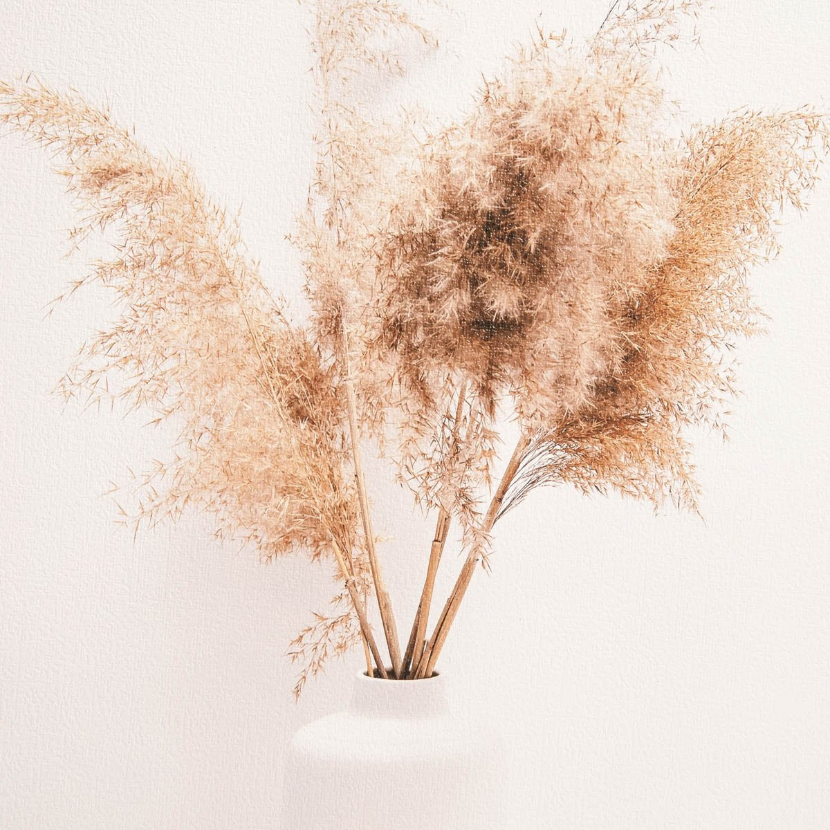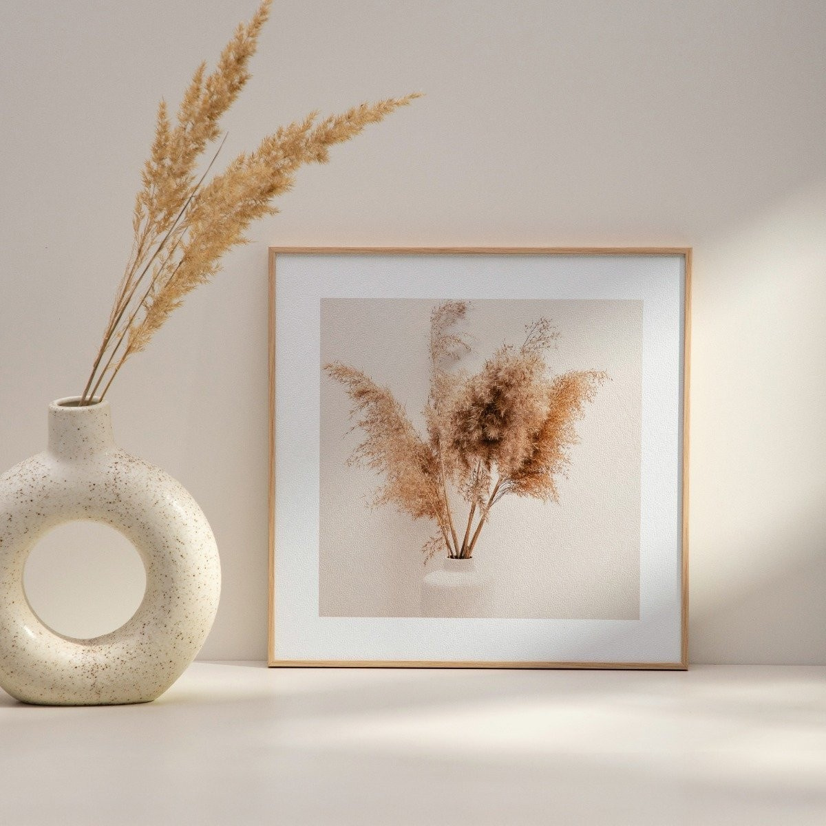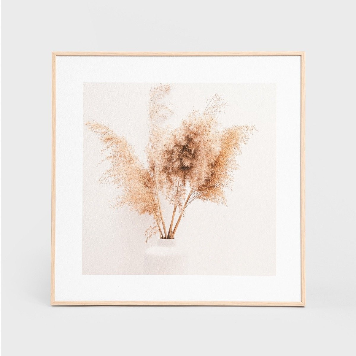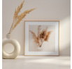 Obraz zobrazuje sušené kytice ve váze na bílém pozadí. Je zasazen do jemného dřevěného rámu, který dokonale ladí s přírodní barevnou paletou obrazu.