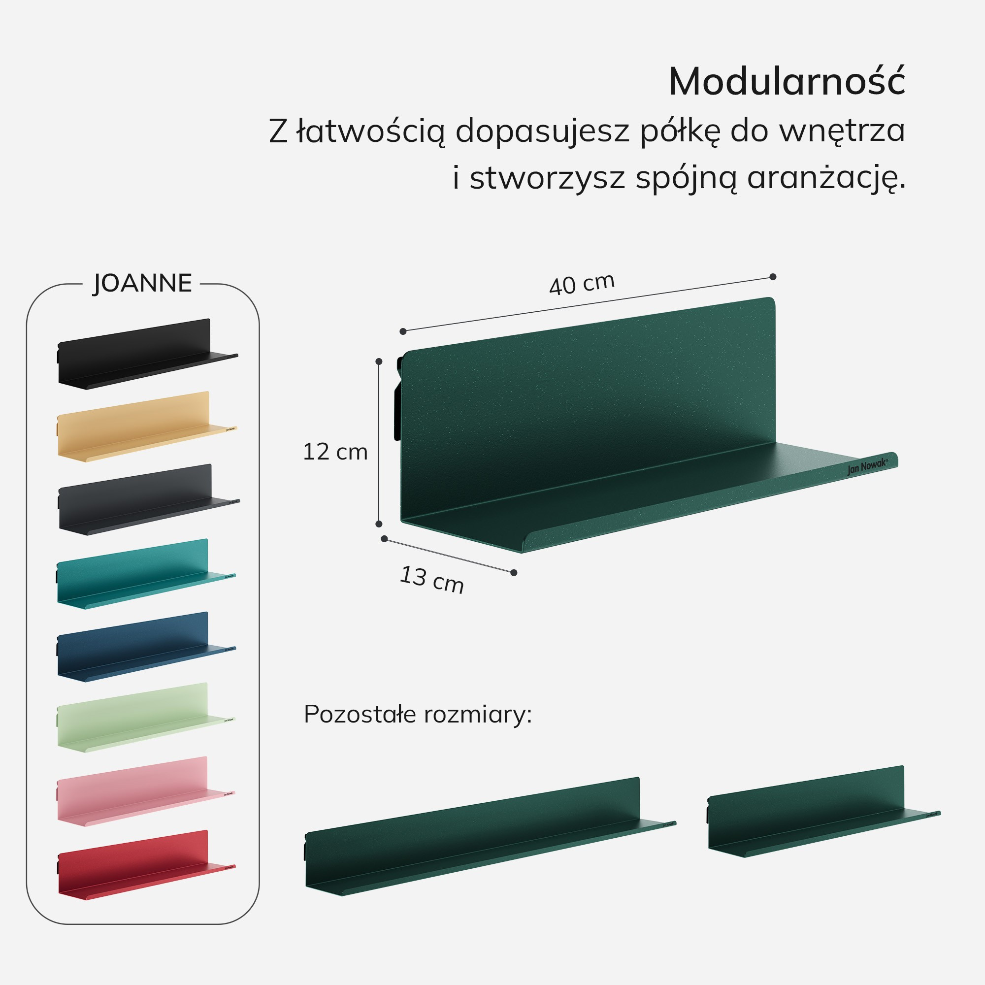 #html-body [data-pb-style=VR6CC8P]{justify-content:flex-start;display:flex;flex-direction:column;background-position:left top;background-size:cover;background-repeat:no-repeat;background-attachment:scroll}#html-body [data-pb-style=FFPM6BJ]{display:none}#html-body [data-pb-style=E454BD8],#html-body [data-pb-style=KXKDBOD]{background-position:left top;background-size:cover;background-repeat:no-repeat;background-attachment:scroll}#html-body [data-pb-style=KXKDBOD]{justify-content:flex-start;display:flex;flex-direction:column;margin-bottom:30px}#html-body [data-pb-style=E454BD8]{align-self:stretch}#html-body [data-pb-style=JDGWTGS]{display:flex;width:100%}#html-body [data-pb-style=LVMUFCE],#html-body [data-pb-style=P6Q9TSX],#html-body [data-pb-style=U3E2V7J]{justify-content:flex-start;display:flex;flex-direction:column;background-position:left top;background-size:cover;background-repeat:no-repeat;background-attachment:scroll;width:8.33333%;align-self:stretch}#html-body [data-pb-style=LVMUFCE],#html-body [data-pb-style=P6Q9TSX]{width:41.6667%;align-self:center}#html-body [data-pb-style=LVMUFCE]{width:50%;align-self:stretch}#html-body [data-pb-style=U19FBAA]{border-style:none}#html-body [data-pb-style=IT6M2U3],#html-body [data-pb-style=KQDYHKI]{max-width:100%;height:auto}#html-body [data-pb-style=FW0FOF1]{justify-content:flex-start;display:flex;flex-direction:column;background-position:left top;background-size:cover;background-repeat:no-repeat;background-attachment:scroll;margin-bottom:10px}#html-body [data-pb-style=MRVDRRO]{margin-top:40px;margin-bottom:40px}#html-body [data-pb-style=IUYUSI9],#html-body [data-pb-style=P5PNAPM]{background-position:left top;background-size:cover;background-repeat:no-repeat;background-attachment:scroll}#html-body [data-pb-style=P5PNAPM]{justify-content:flex-start;display:flex;flex-direction:column;margin-bottom:40px}#html-body [data-pb-style=IUYUSI9]{align-self:stretch}#html-body [data-pb-style=ULO2IEA]{display:flex;width:100%}#html-body [data-pb-style=NG6JKUV]{justify-content:flex-start;display:flex;flex-direction:column;background-position:left top;background-size:cover;background-repeat:no-repeat;background-attachment:scroll;width:50%;align-self:stretch}#html-body [data-pb-style=B74DATL]{border-style:none}#html-body [data-pb-style=INQMTV2],#html-body [data-pb-style=JI5AW9E]{max-width:100%;height:auto}#html-body [data-pb-style=Y40X40C]{justify-content:flex-start;display:flex;flex-direction:column;width:50%;align-self:center}#html-body [data-pb-style=LNMVOOX],#html-body [data-pb-style=URUA3YU],#html-body [data-pb-style=Y40X40C]{background-position:left top;background-size:cover;background-repeat:no-repeat;background-attachment:scroll}#html-body [data-pb-style=URUA3YU]{justify-content:flex-start;display:flex;flex-direction:column;margin-bottom:40px}#html-body [data-pb-style=LNMVOOX]{align-self:stretch}#html-body [data-pb-style=CRC3HFQ]{display:flex;width:100%}#html-body [data-pb-style=HFRIJOU],#html-body [data-pb-style=OFEU7LC]{justify-content:flex-start;display:flex;flex-direction:column;background-position:left top;background-size:cover;background-repeat:no-repeat;background-attachment:scroll;width:50%;align-self:center}#html-body [data-pb-style=HFRIJOU]{align-self:stretch}#html-body [data-pb-style=XUBXTH7]{border-style:none}#html-body [data-pb-style=I8G38RB],#html-body [data-pb-style=LR2Y8NB]{max-width:100%;height:auto}#html-body [data-pb-style=EIQ1RVX],#html-body [data-pb-style=J12UERK]{background-position:left top;background-size:cover;background-repeat:no-repeat;background-attachment:scroll}#html-body [data-pb-style=EIQ1RVX]{justify-content:flex-start;display:flex;flex-direction:column;margin-bottom:40px}#html-body [data-pb-style=J12UERK]{align-self:stretch}#html-body [data-pb-style=NFF6GDC]{display:flex;width:100%}#html-body [data-pb-style=PUXUBO8]{justify-content:flex-start;display:flex;flex-direction:column;background-position:left top;background-size:cover;background-repeat:no-repeat;background-attachment:scroll;width:50%;align-self:stretch}#html-body [data-pb-style=Y67E9OV]{border-style:none}#html-body [data-pb-style=D0NXRK3],#html-body [data-pb-style=N86SFDX]{max-width:100%;height:auto}#html-body [data-pb-style=I53AQA8]{justify-content:flex-start;display:flex;flex-direction:column;background-position:left top;background-size:cover;background-repeat:no-repeat;background-attachment:scroll;width:50%;align-self:center}@media only screen and (max-width: 768px) { #html-body [data-pb-style=B74DATL],#html-body [data-pb-style=U19FBAA],#html-body [data-pb-style=XUBXTH7],#html-body [data-pb-style=Y67E9OV]{border-style:none} }Vlastnosti závěsné police: Odolná konstrukce z oceli Skrytý systém upevnění Plná zadní stěna Zaoblená přední hrana Jednoduchá a rychlá montáž Lahvově zelená s třpytivými částečkami Sparkling Brilliance™ Závěsná police JOANNE v lahvově zelené – elegance s nádechem lesku Kovová závěsná police JOANNE v hluboké lahvově zelené z kolekce Modern přináší do interiéru sofistikovaný a moderní charakter. Díky speciální barvě Sparkling Brilliance™ se povrch jemně třpytí na světle, což prostoru dodává elegantní vzhled. Nástěnná police je efektní místo na knihy, dekorace, rostliny nebo každodenní doplňky. Osvědčí se v obývacím pokoji, kanceláři a designérské pracovně.Odolná a efektní konstrukce Zelená police o délce 400 mm je vyrobena z vysoce kvalitní válcované oceli o tloušťce 1,1 mm. Malování barvou Sparkling Brilliance™ zajišťuje odolnost proti poškrábání, mechanickému poškození a korozi, a zároveň poskytuje výjimečný lesk povrchu.Funkčnost a bezpečnost Plná zadní stěna police zabraňuje sklouzávání předmětů a zaoblená přední část zvyšuje komfort a bezpečnost používání. Závěsná police spojuje elegantní design s praktickými řešeními, osvědčuje se v moderních domech a kancelářských prostorech.Intuitivní montá