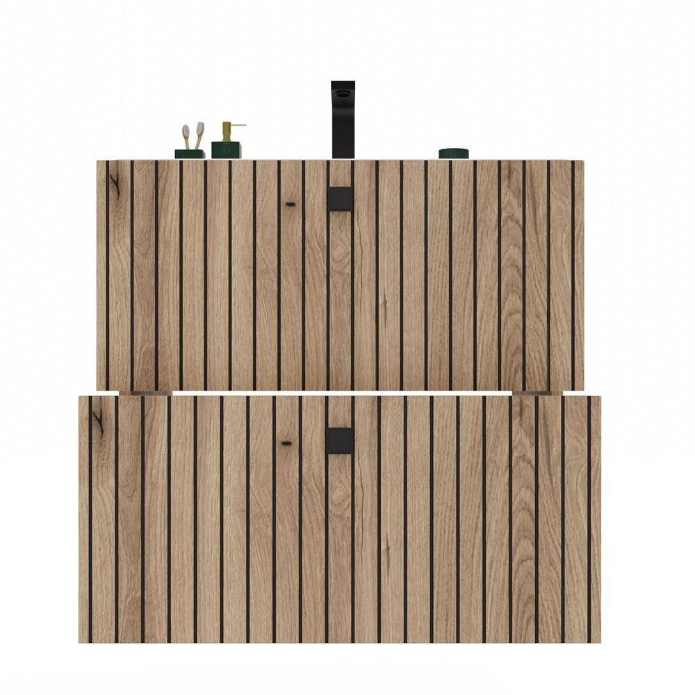 Objevte umyvadlovou skříňku Torio – elegantní spojení funkčnosti a moderního designu pro vaši koupelnu. Teplý odstín dubu evoke a drážkovaný povrch čela dodávají nábytku jedinečný styl. Promyšlené vnitřní uspořádání zásuvek se systémem pomalého dovírání a s výřezem pro sifon umožňuje optimální využití prostoru.