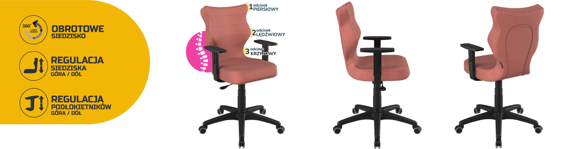 Konkávně-konvexní tvar opěradla zajišťuje správné nastavení páteře a poskytuje uživateli maximální úlevu pro páteř. Vypouklá část sedáku v úrovni bederní oblasti umožňuje správnou polohu nohou a hýždí a ponechává je v jejich přirozené poloze. Dobrá židle pečuje o hrudní, bederní a křížovou oblast.