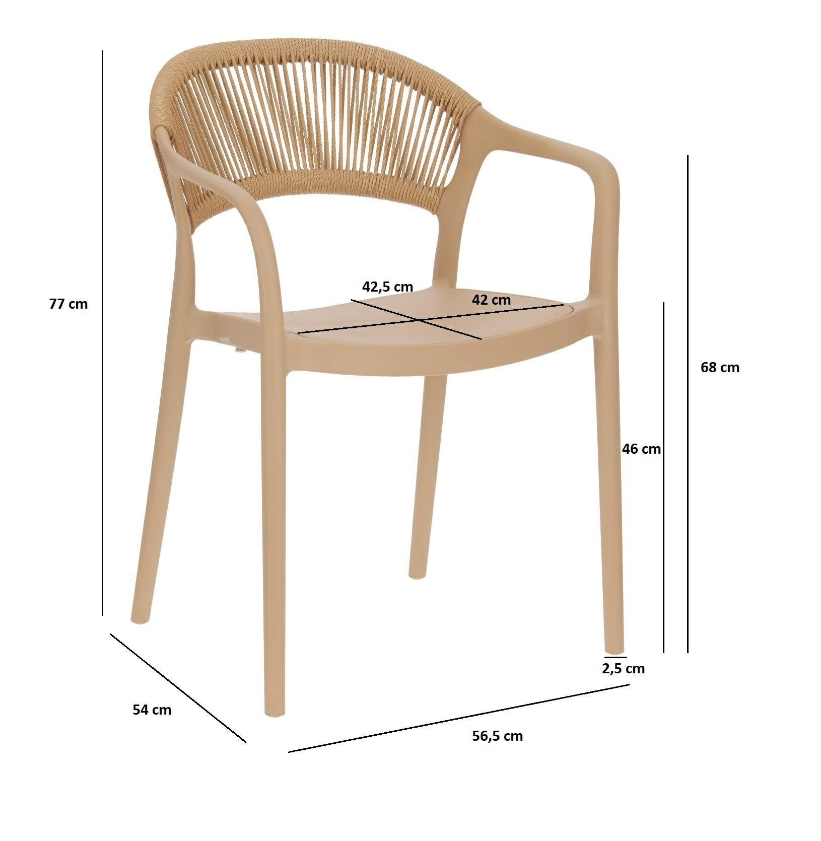 Křeslo Osma je kombinací odolného polypropylenu vůči UV záření s výpletem z provazu z plastu (polyesteru). Židle s pohodlným, mírně zaobleným opěradlem je také vybavena područkami. Zajímavé opěradlo je nejen efektní, ale také pohodlné. Měkké šňůrky se skládají podle tvaru zad. Max. zatížení 120 kg. Židle nevyžaduje montáž. Židle je stohovatelná. Maximální stohování 6 ks. Židle je vhodná pro venkovní použití. Tloušťka nohou: 2,5 cm Výška područek: 68 cm Hloubka sedáku: 42,5 cm Šířka sedáku: 42 cm Hmotnost židle: 4,5 kg