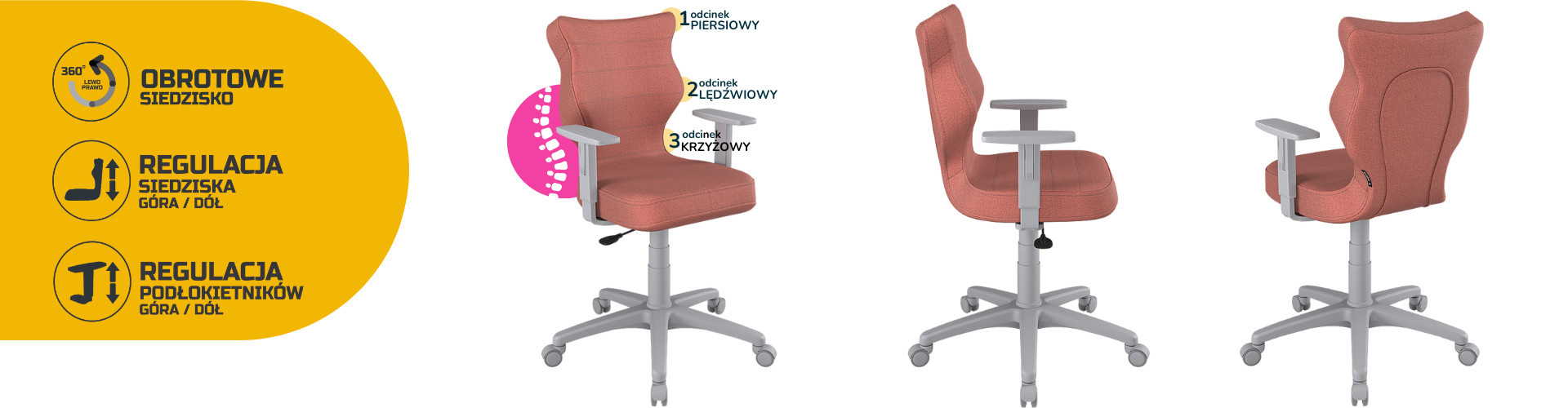 Konkávně-konvexní tvar opěradla zajišťuje správné nastavení páteře a poskytuje uživateli maximální úlevu pro páteř. Vypouklá část sedáku v úrovni bederní oblasti umožňuje správnou polohu nohou a hýždí a ponechává je v jejich přirozené poloze. Dobrá židle pečuje o hrudní, bederní a křížovou oblast.