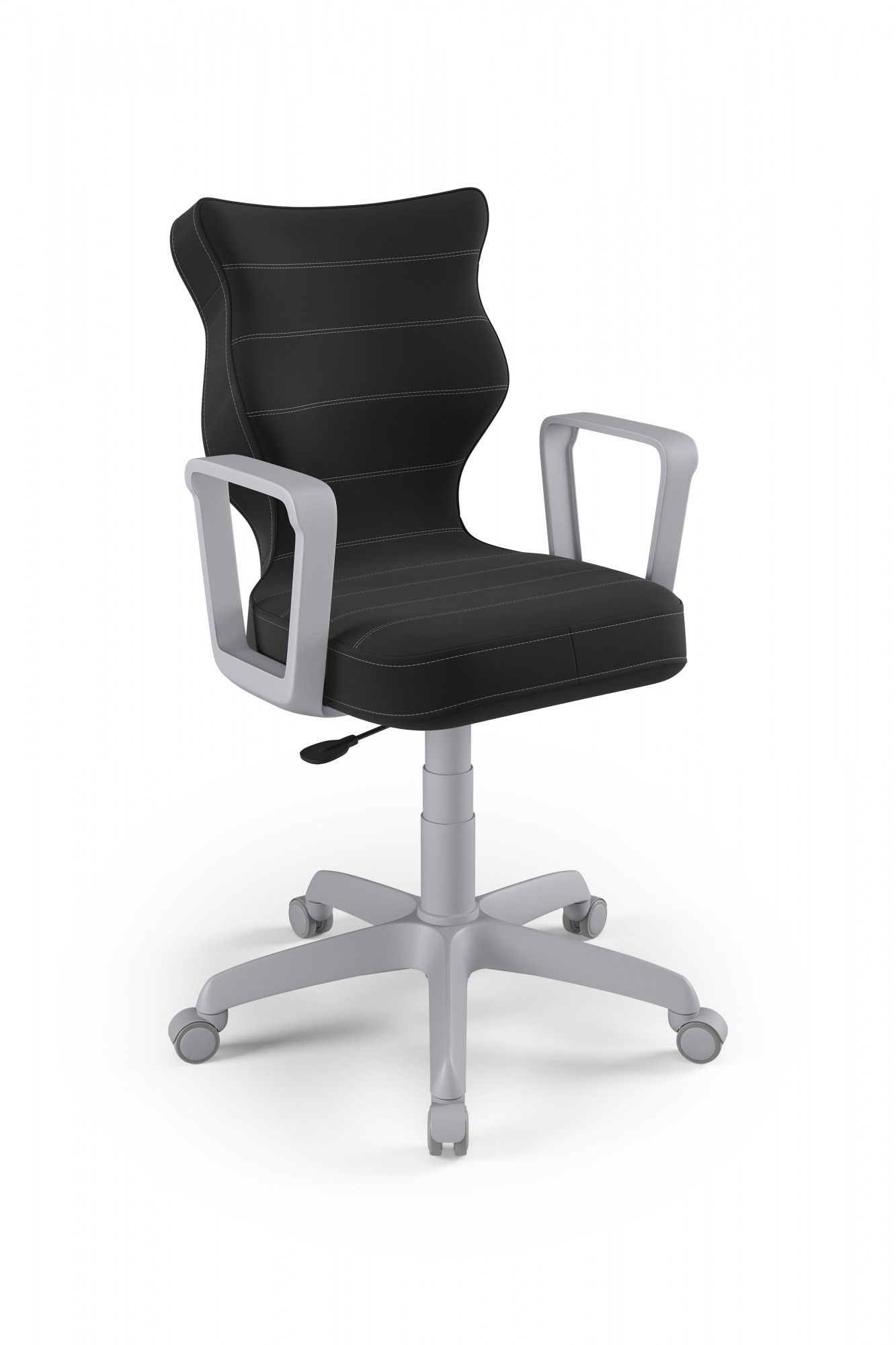 Otočná židle pro teenagery je důležitým kusem nábytku v pokoji každého teenagera. Pro naše zákazníky jsme připravili model Norm, jehož sedadlo je ergonomicky tvarované, díky čemuž uživatel získá maximální pohodlí. Jsme přesvědčeni, že náš výrobek splní vaše očekávání. Čím se židle Norm youth swivel vyznačuje? - Ergonomický sedák z plastu, - pevné područky, rovněž z plastu, v bílé barvě - sedací deska má ocelovou přímou páku, takže židli lze účinně nastavit, - sloupek v podobě plynového zdvihu z oceli a plastu, - teleskopický kryt plynového zdvihu, - měkká šedá kolečka
