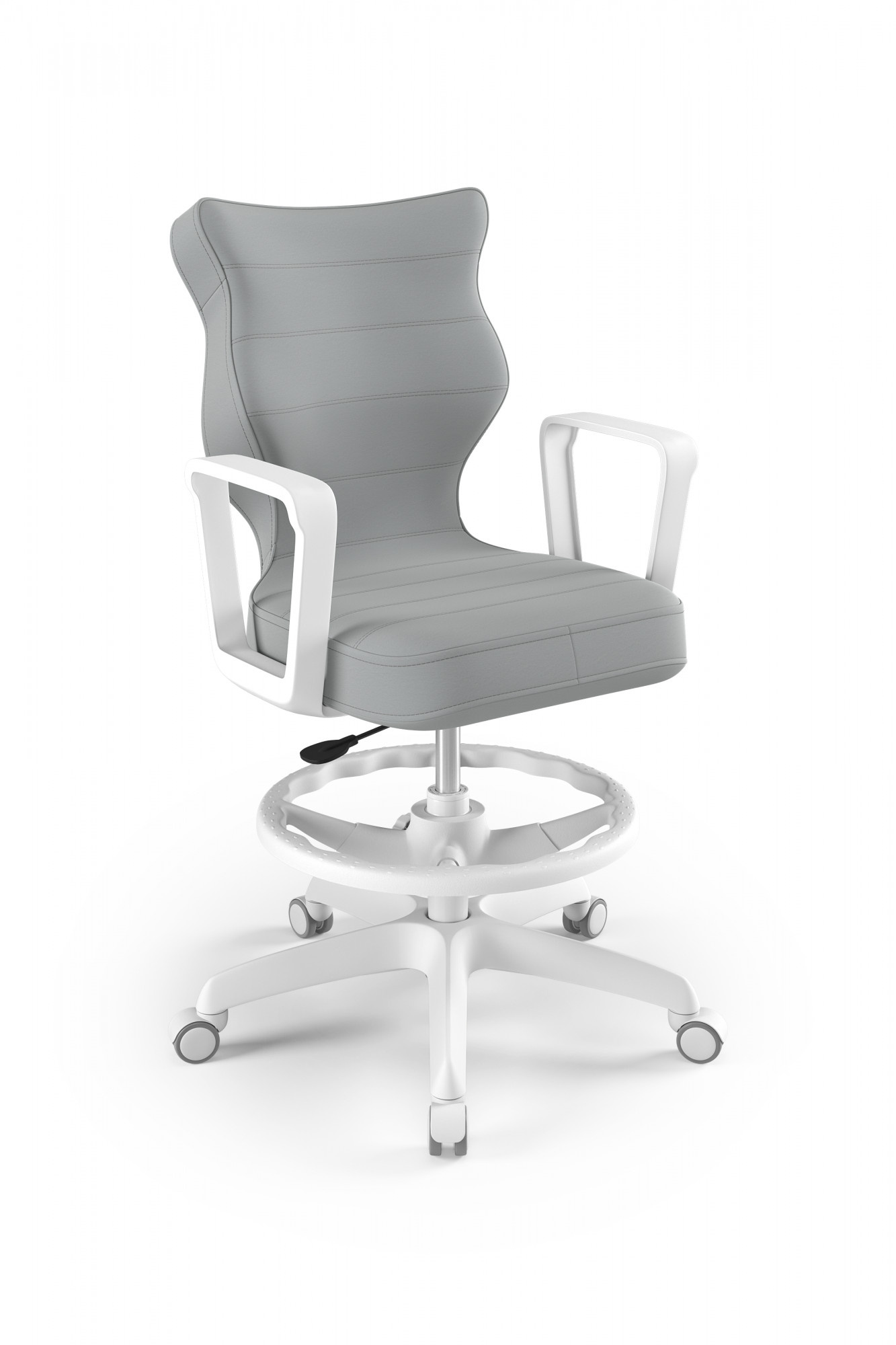 Otočná židle pro teenagery je důležitým kusem nábytku v pokoji každého teenagera. Pro naše zákazníky jsme připravili model Norm, jehož sedadlo je ergonomicky tvarované, díky čemuž uživatel získá maximální pohodlí. Jsme přesvědčeni, že náš výrobek splní vaše očekávání. Čím se židle Norm youth swivel vyznačuje? - Ergonomický sedák z plastu, - pevné područky, rovněž z plastu, v bílé barvě - sedací deska má ocelovou přímou páku, takže židli lze účinně nastavit, - sloupek v podobě plynového zdvihu z oceli a plastu, - podnožka s nastavitelnou výškou - měkká bílá kolečka