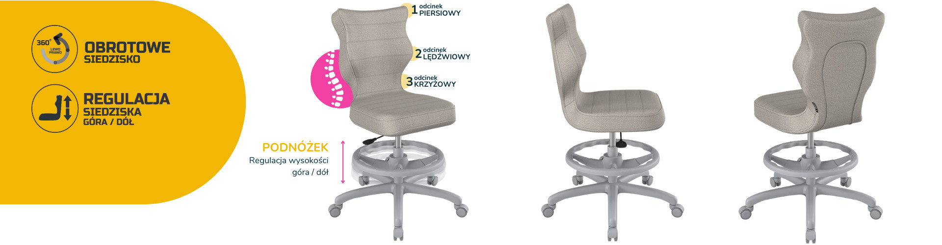 Moderní židle s podnožkou Petit s šedým podstavcem je inovativním návrhem. Celá řada se vyznačuje hlavním tématem ergonomického designu a podpory zdravého sezení. Jak do tohoto konceptu zapadá tato neobvyklá židle? Opěradlo je přesně přizpůsobeno tvaru páteře. Záda jsou tak méně unavená. Naše čalouněná židle vás nutí zaujmout zdravou polohu při sezení, která zároveň poskytuje maximální pohodlí.