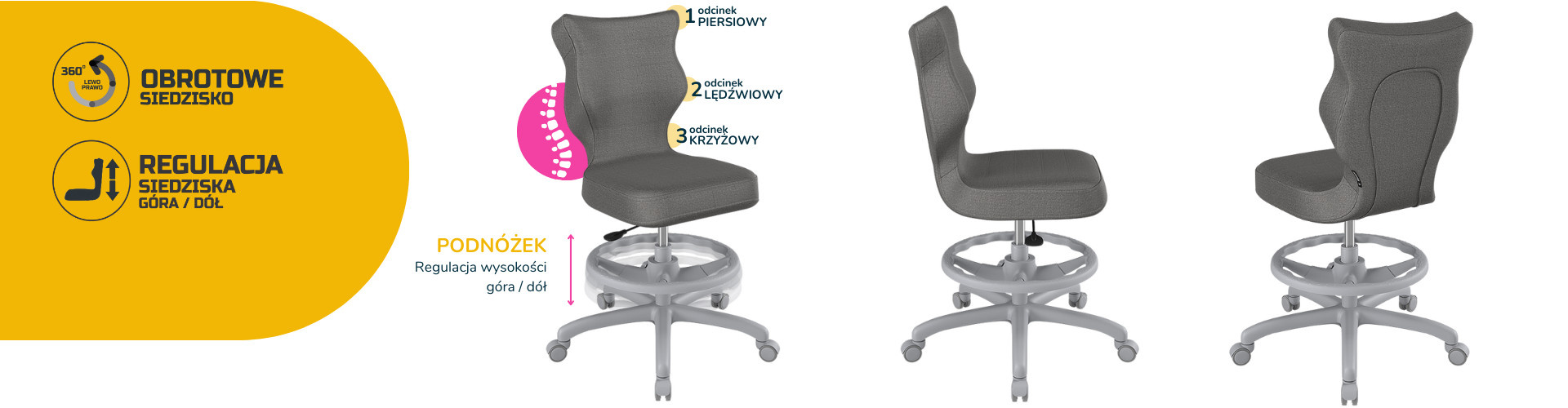 Moderní židle s podnožkou Petit s šedým podstavcem je inovativním návrhem. Celá řada se vyznačuje hlavním tématem ergonomického designu a podpory zdravého sezení. Jak do tohoto konceptu zapadá tato neobvyklá židle? Opěradlo je přesně přizpůsobeno tvaru páteře. Záda jsou tak méně unavená. Naše čalouněná židle vás nutí zaujmout zdravou polohu při sezení, která zároveň poskytuje maximální pohodlí.