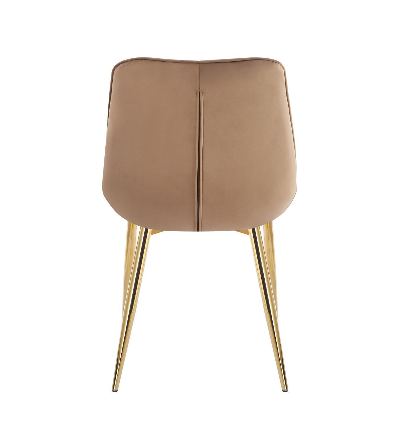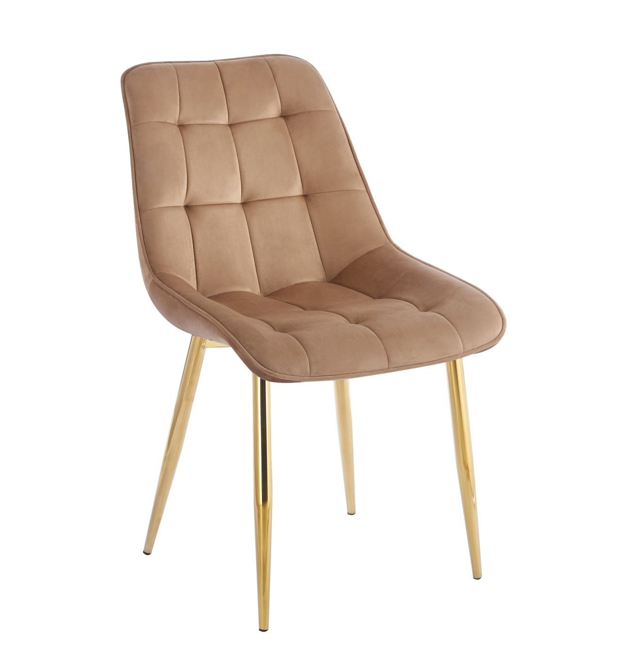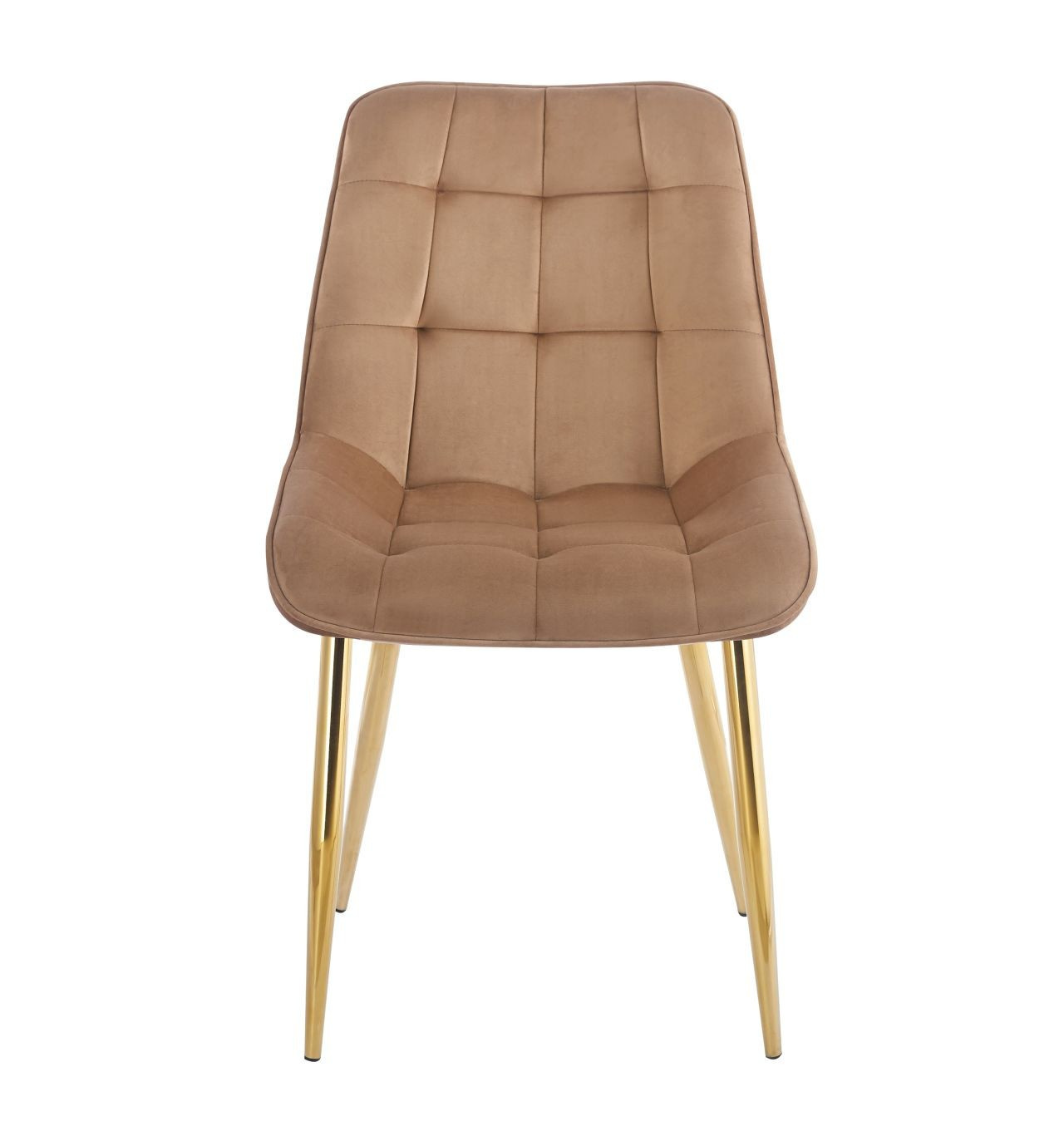 Rozměry: - šířka sedáku: 51 cm - výška sedáku: 49 cm - celková výška: 89 cm - hloubka sedáku: 44 cm Materiál - čalounění: samet Davis Riviera 24 - nohy: chrom Barva: - sedák: cappuccino - nohy: zlaté
